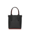 Black leather mini tote bag from Christian Louboutin. The Cabata mini tote has a pebbled calf leather, two top handles with spike embellished loops, adjustable shoulder strap and a signature sneaker sole -inspired red rubber base.