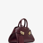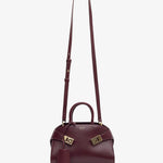 Burgundy leather mini bag from Ferragamo. The Hug mini bag is made from calfskin leather with rounded edges, featuring two straps that emanate from the back quadrant wrapping the billows, fastening at the front via two golden Hug buckles. It is complete with a keychain charm along with a detachable shoulder strap.