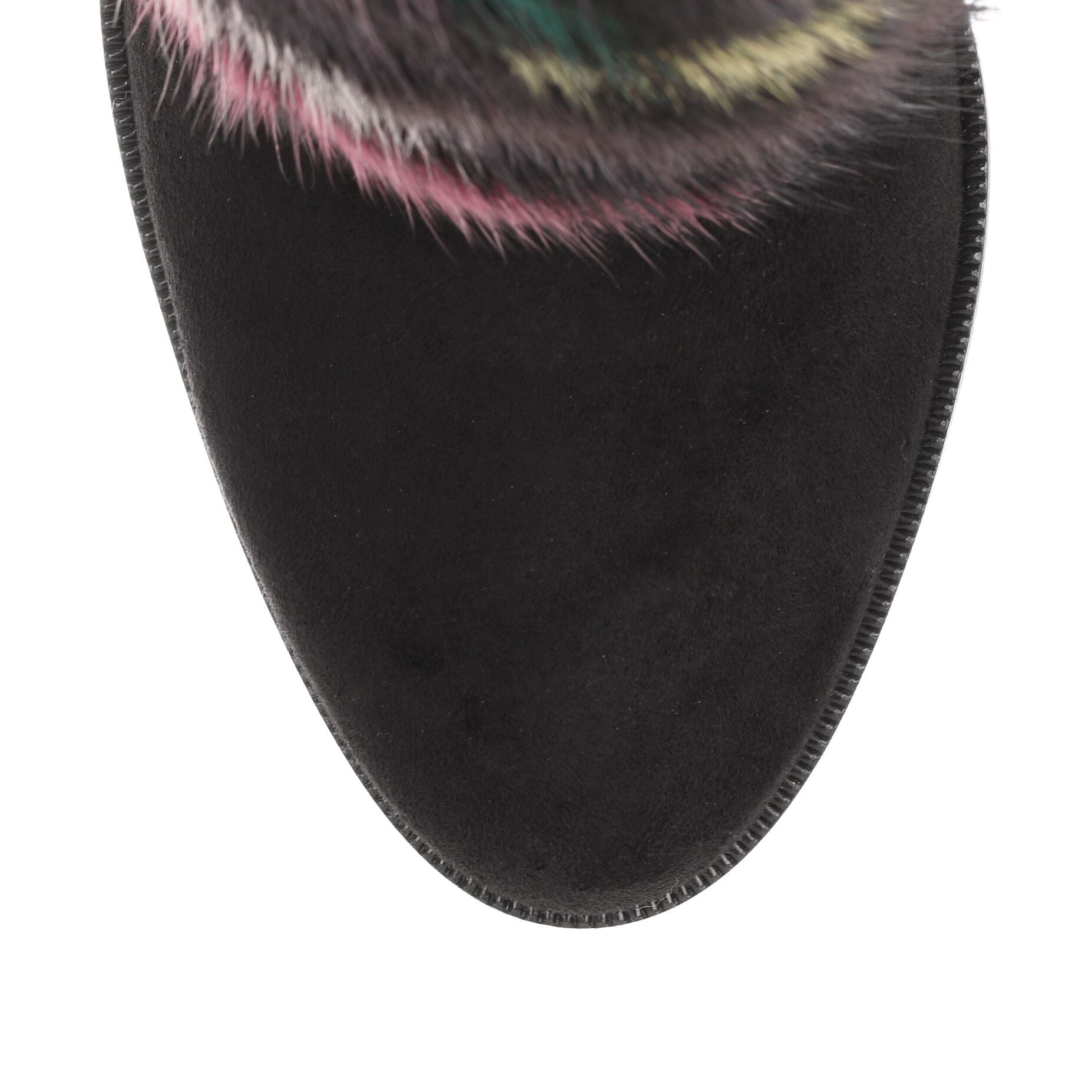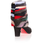 Black suede and mink ankle boot from Christian Louboutin. The Alexandra has a 70mm block heel, multi-coloured striped mink fur detailing, and a slip-on design.