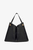 Black leather shoulder bag from The Row. The Alexia bag is made of polished saddle leather with an interior tie closure, flat handles along with an architectural draping to create volume.