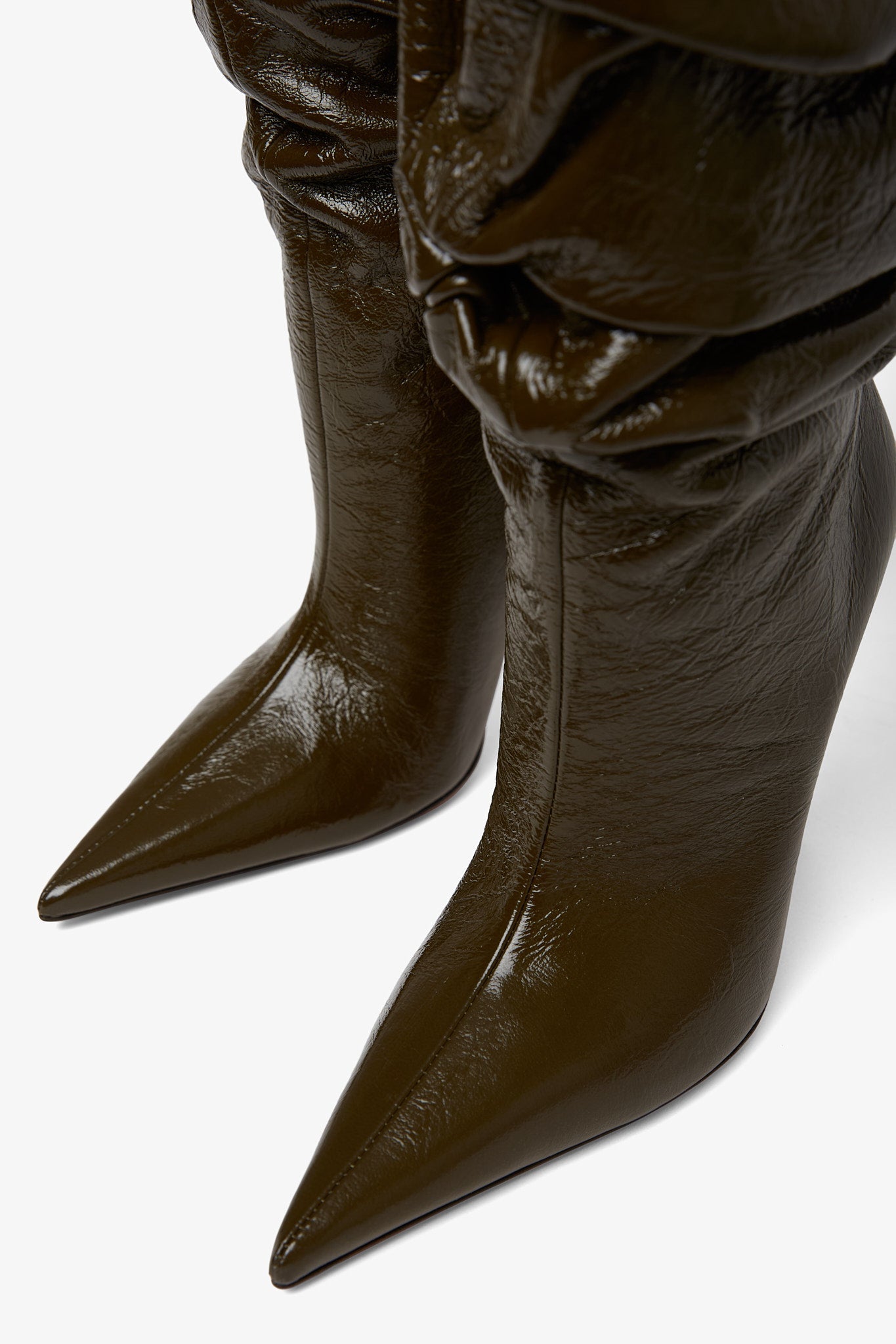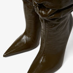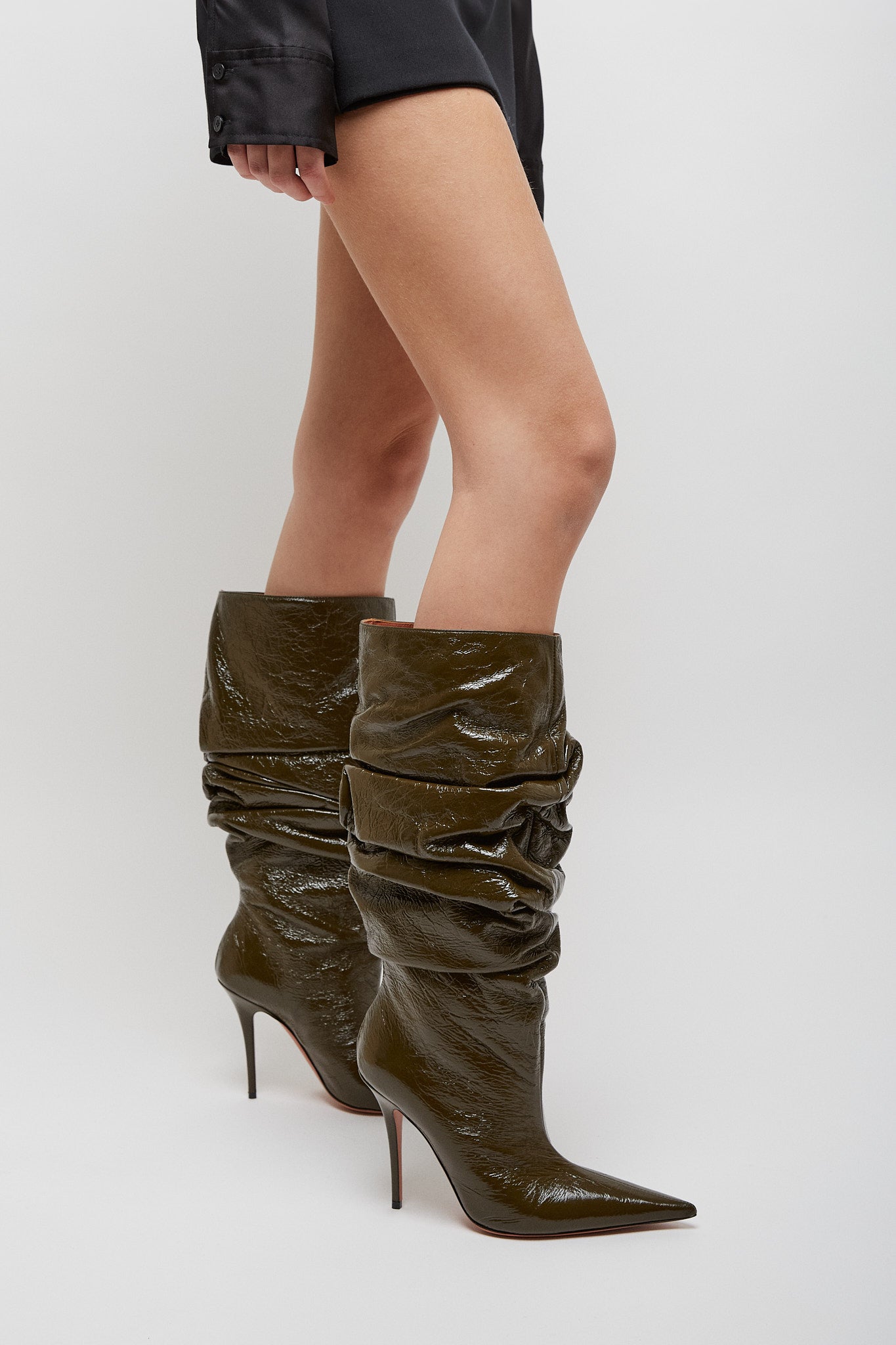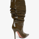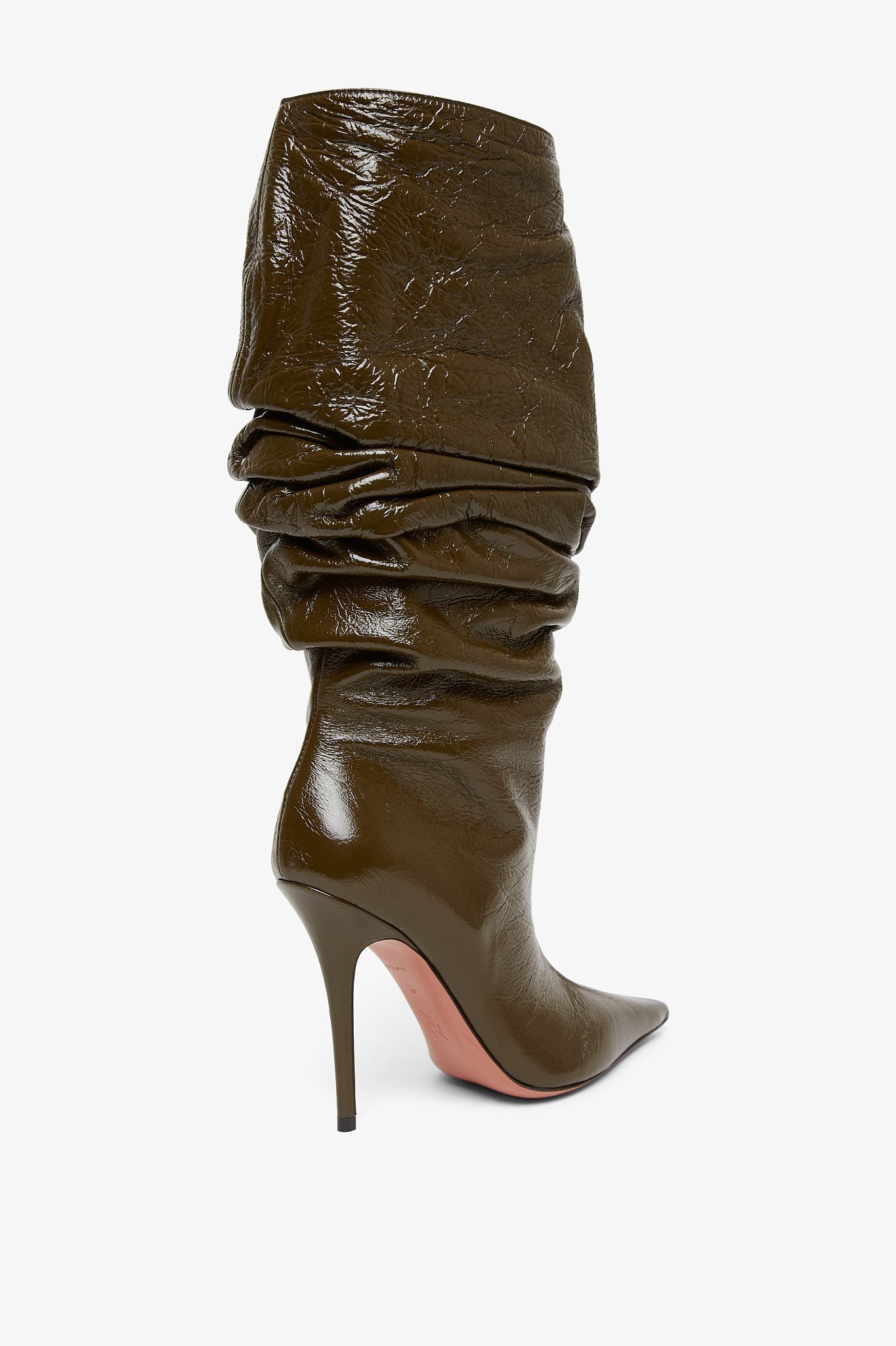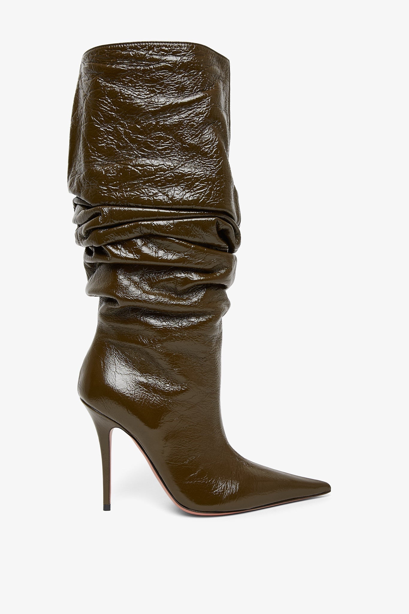 Olive brown knee-high boots from Amina Muaddi. The Anok boots are made of leather with sharply pointed toes, and slouchy shafts, set on a slim stiletto heel measuring 105mm.