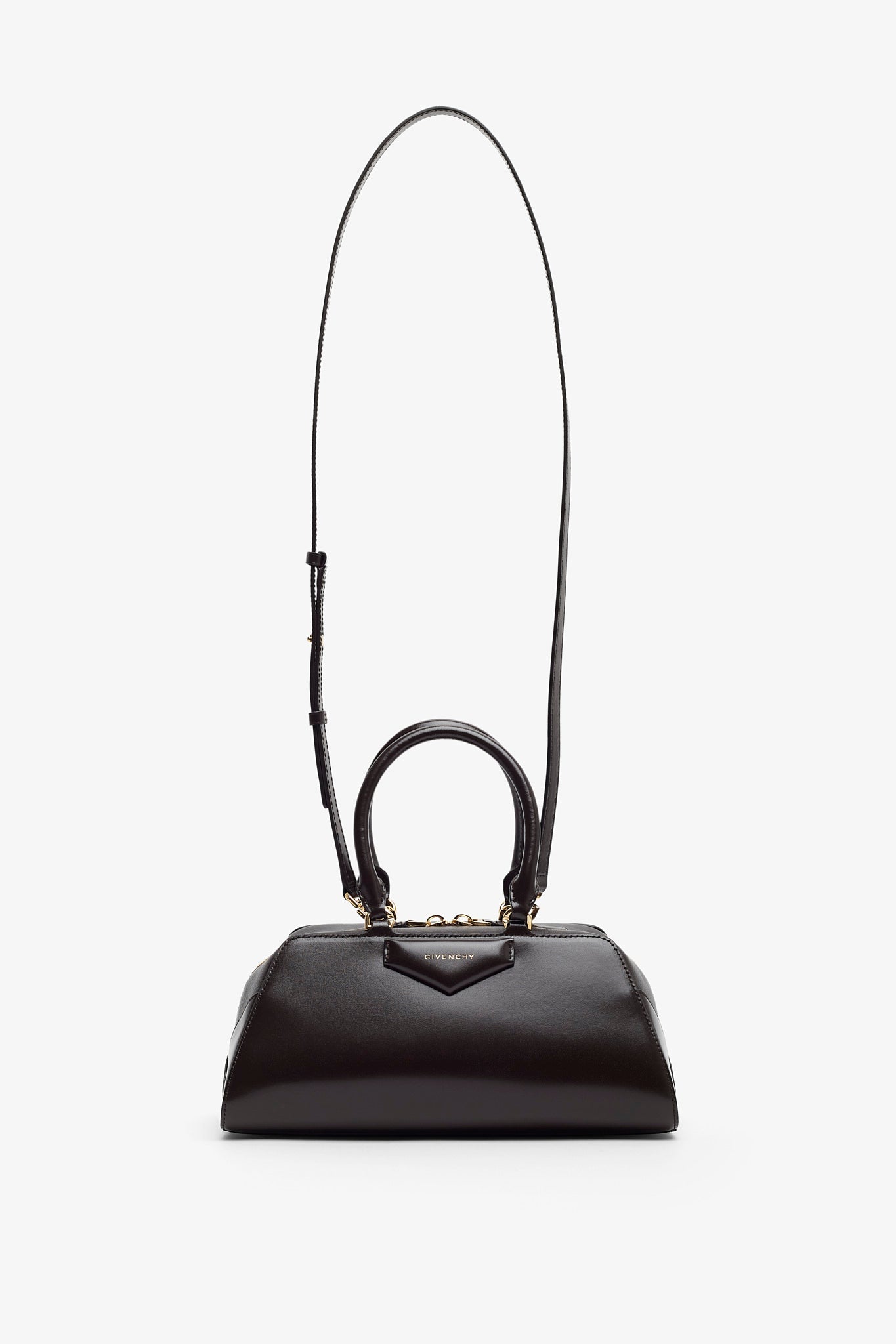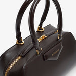 Brown leather handbag from Givenchy. The Antigona east west small handbag is made of calfskin leather, in a long east-west shape with origami-style gusset construction with zipped closure. It has articulated leather handles with four D-rings for the shoulder strap, complete with an adjustable and removable leather shoulder strap.