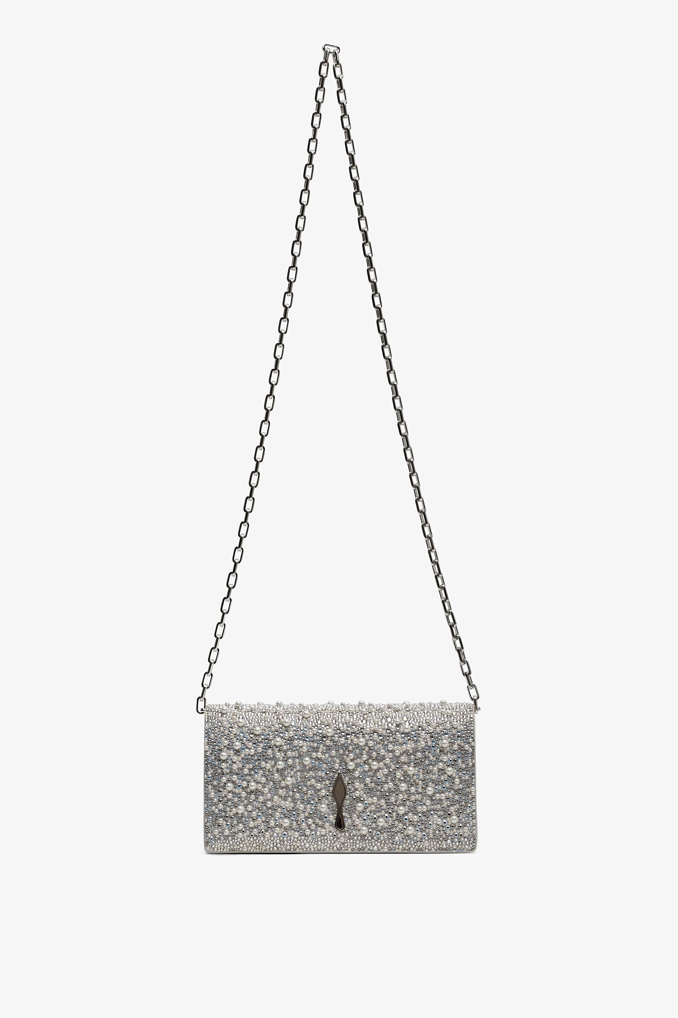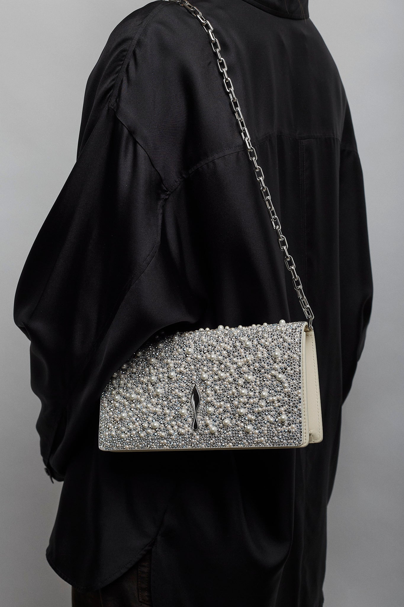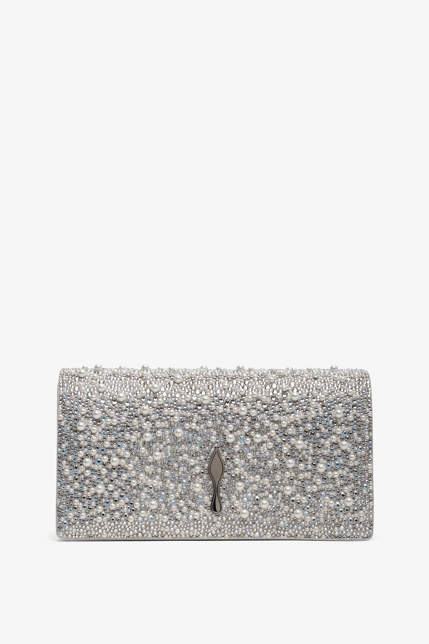 Silver strass clutch bag from Christian Louboutin. The Bettina clutch bag features a silver embellishment on the front, evoking the silhouette of the iconic sole. It is made in black suede calf leather and enhanced with 3,896 strass and 1,754 pearls.
