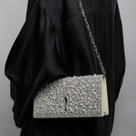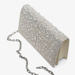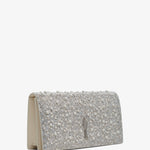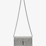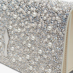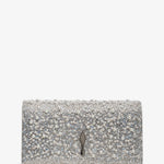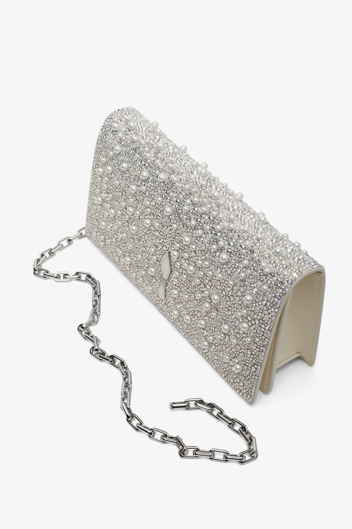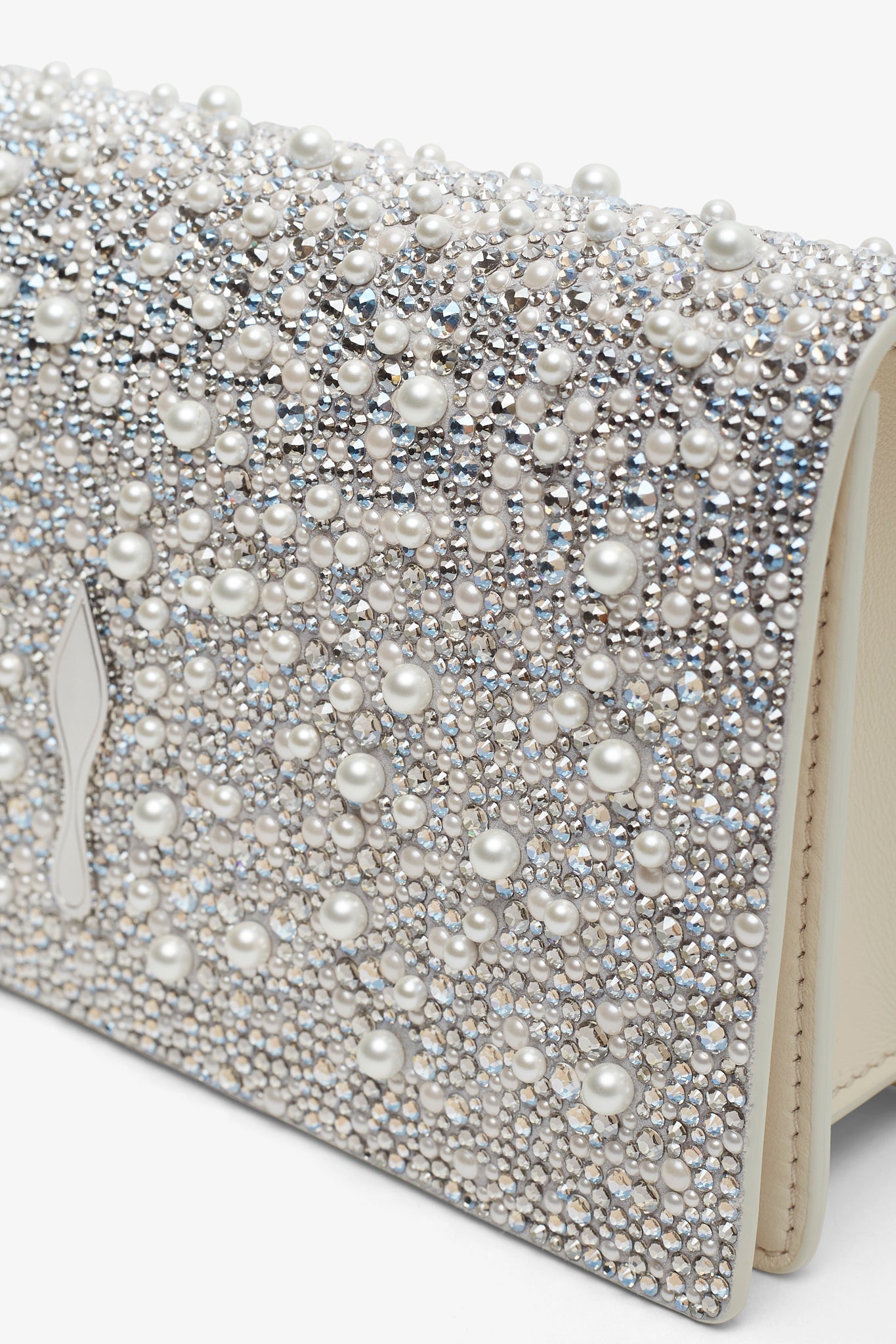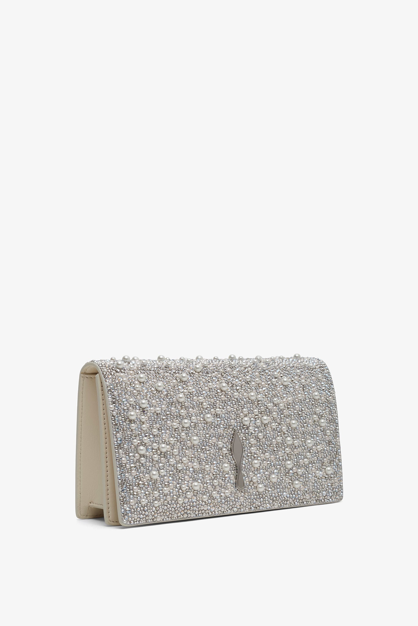 Silver strass clutch bag from Christian Louboutin. The Bettina clutch bag features a silver embellishment on the front, evoking the silhouette of the iconic sole. It is made in black suede calf leather and enhanced with 3,896 strass and 1,754 pearls.