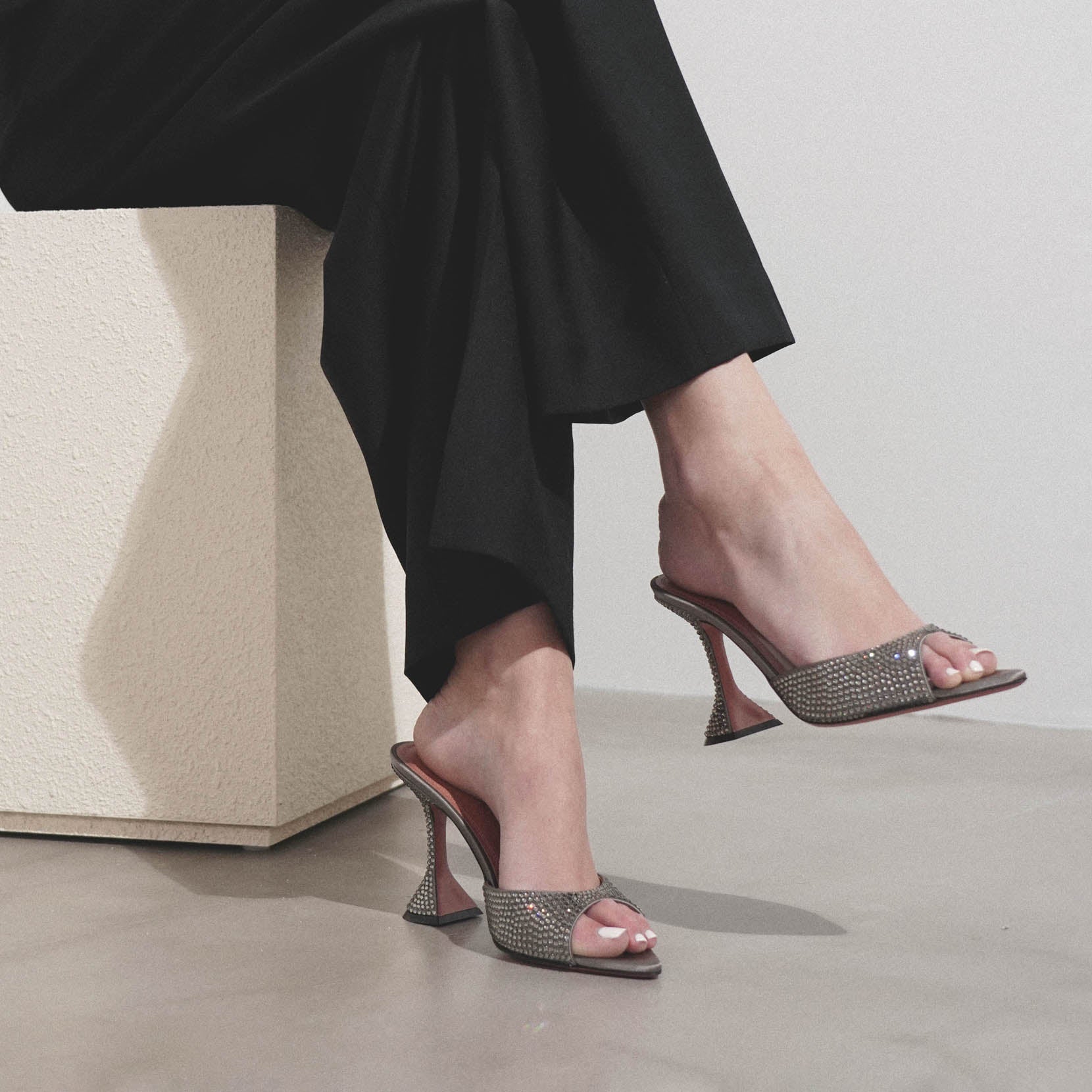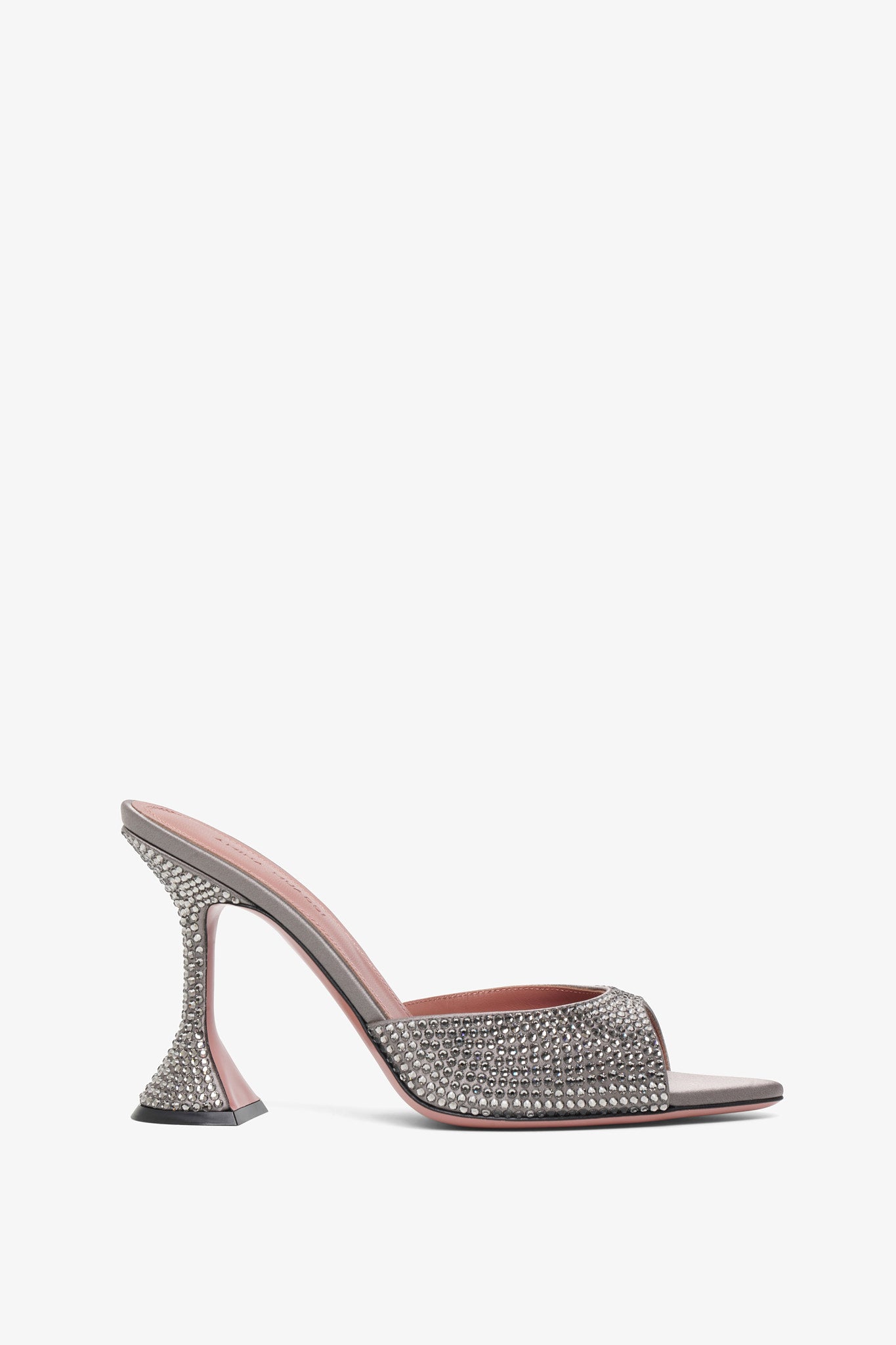 Dark grey crystal mules from Amina Muaddi. The Caroline mules are made of dark grey satin embellished with tonal crystals, an elegantly rounded toe featuring the designer’s signature "Martini" heel measuring 95mm.