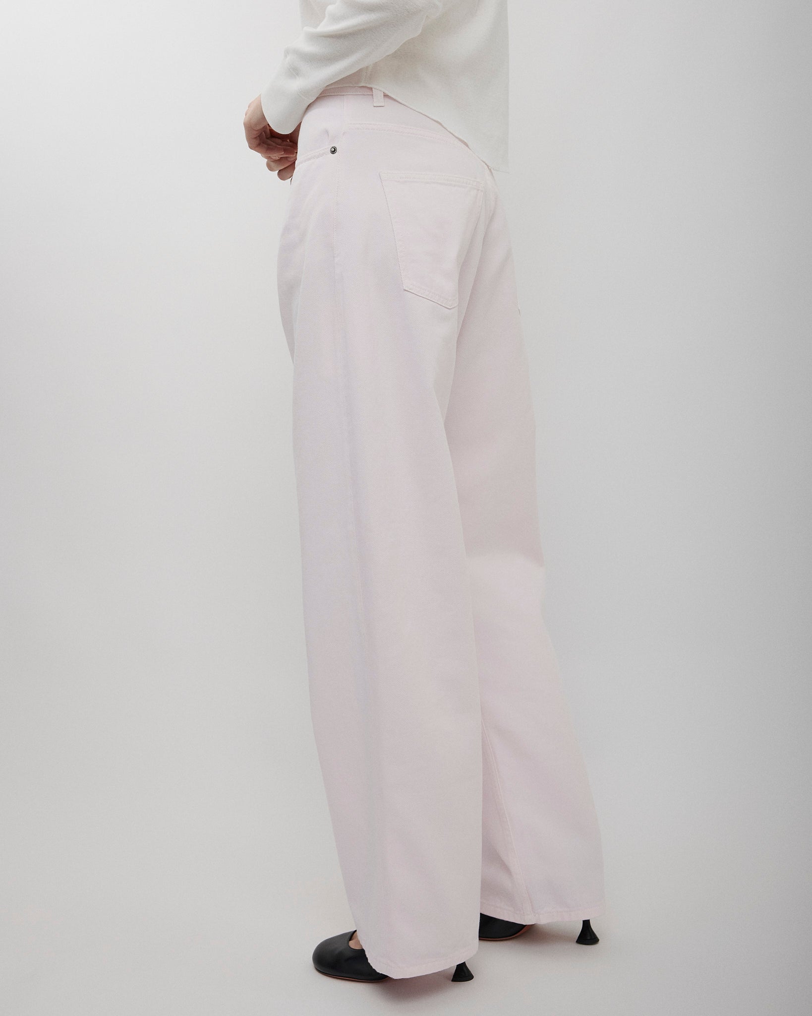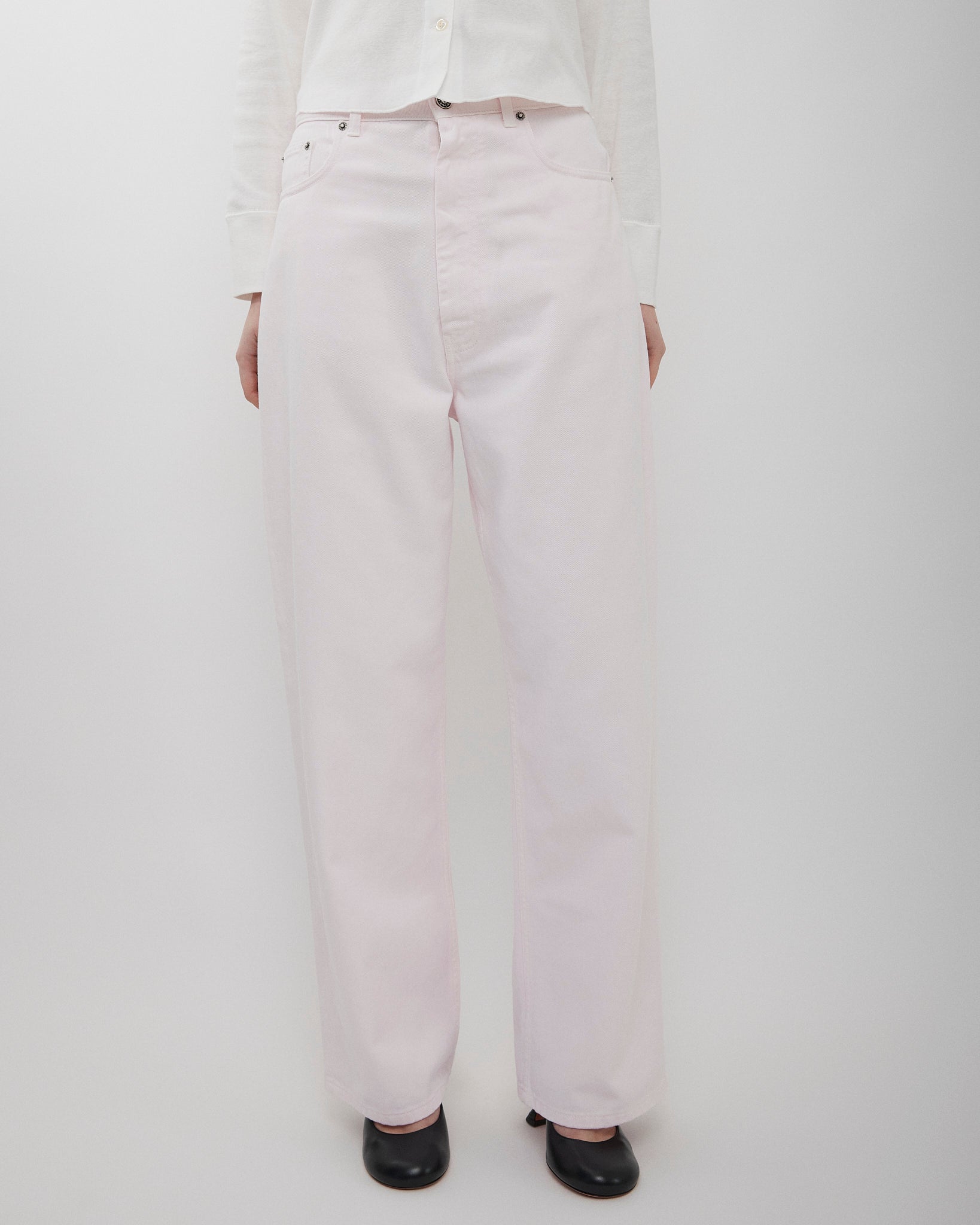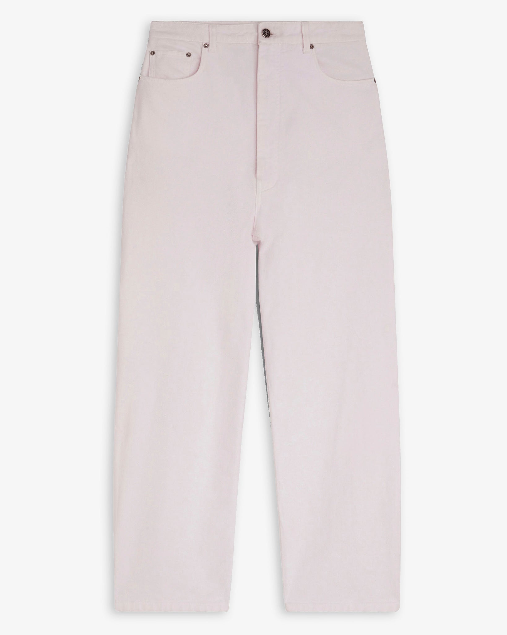 Low-waisted jeans in pink cotton drill from Phoebe Philo. The trousers feature an exaggerated fit, a wide leg, ride low on the hips and pool on the floor.
