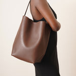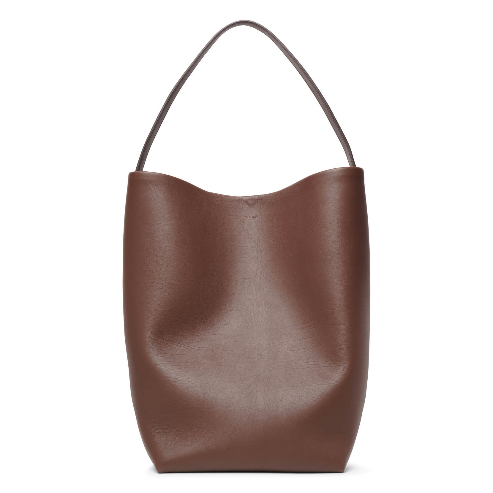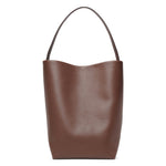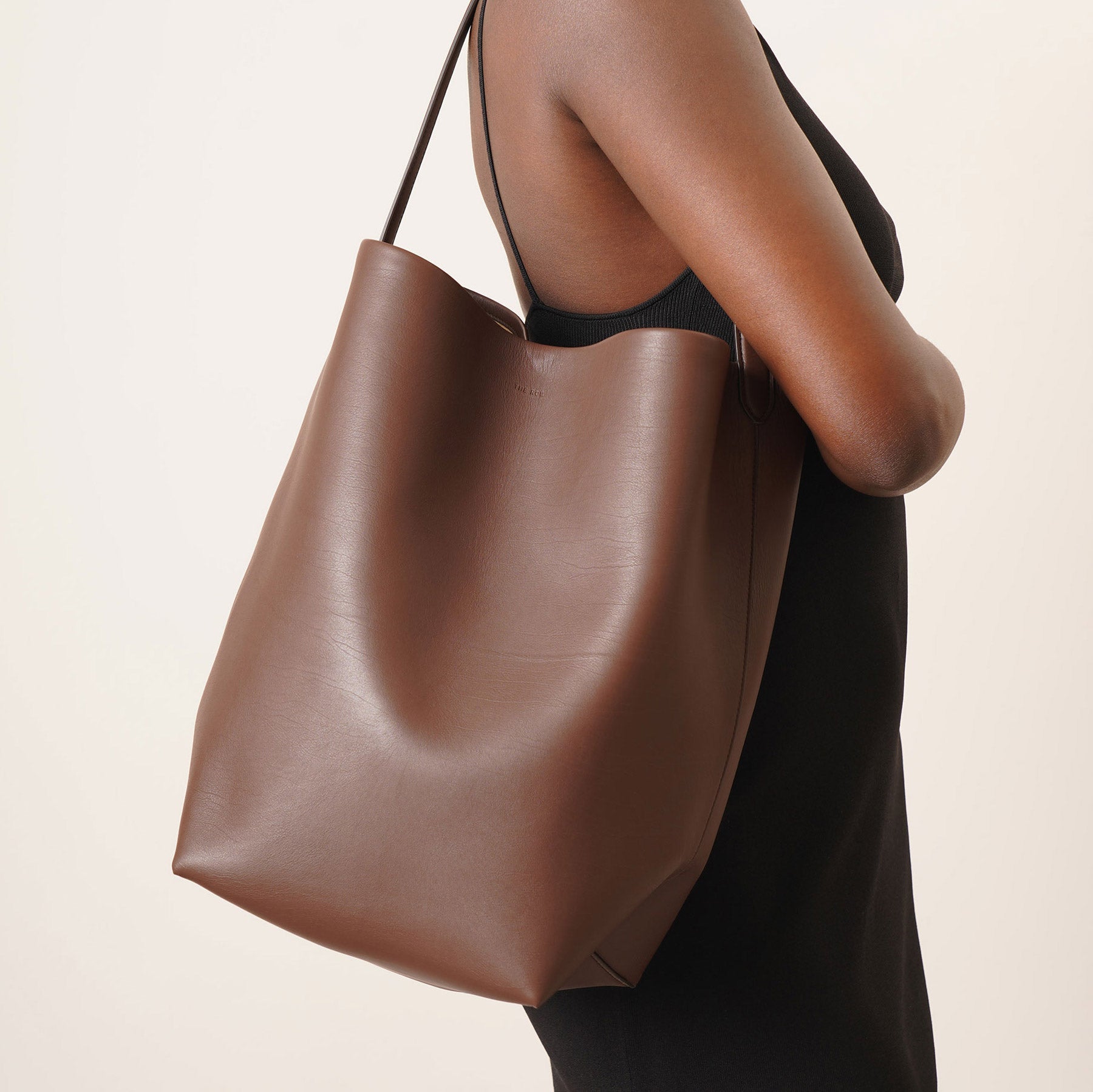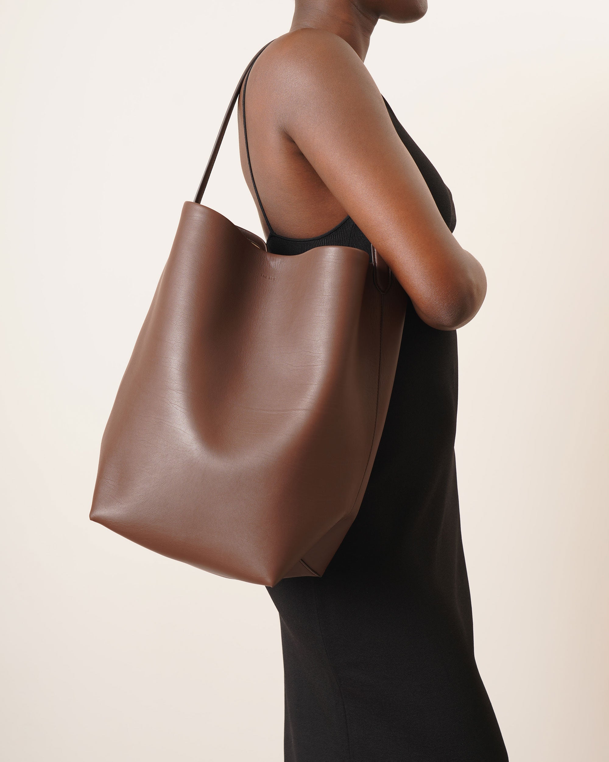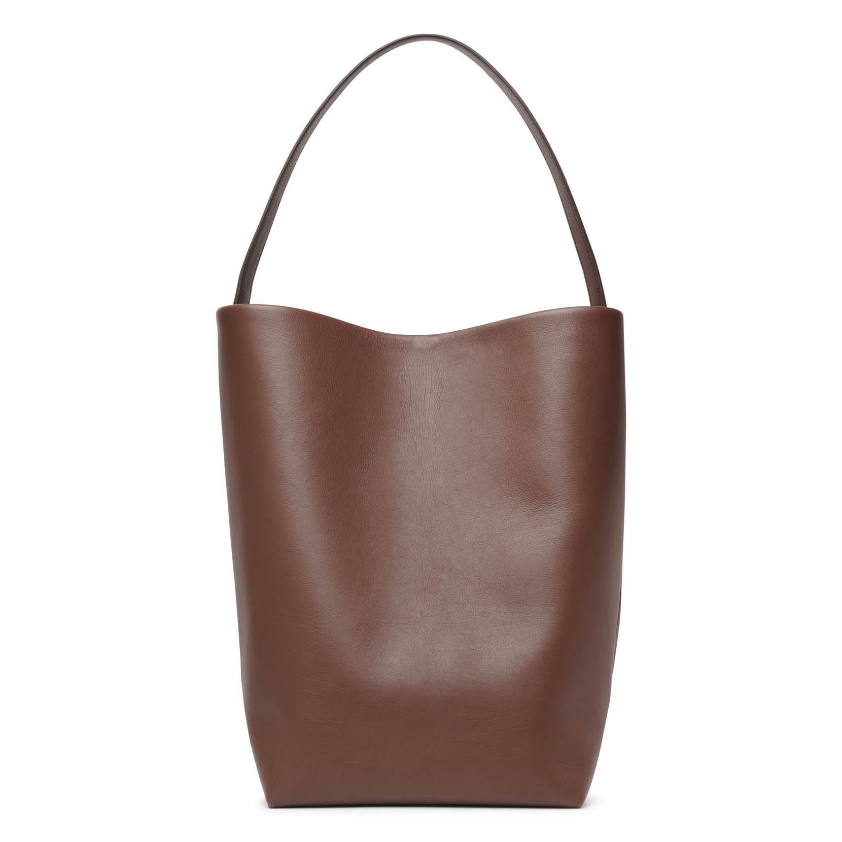 Brown leather tote bag from The Row. The Large N/S Park tote bag is made of smooth calfskin leather featuring an interior toggle closure and flat handles, complete with suede lining.