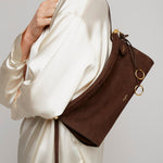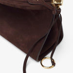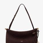 Brown nubuck shoulder bag from Alaïa. The Le Click East West medium shoulder bag is made in nubuck in a curved silhouette that hugs the body, featuring a hinge opening system, decorative ties with metallic rings, an adjustable strap and suede leather lining inside.