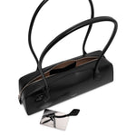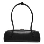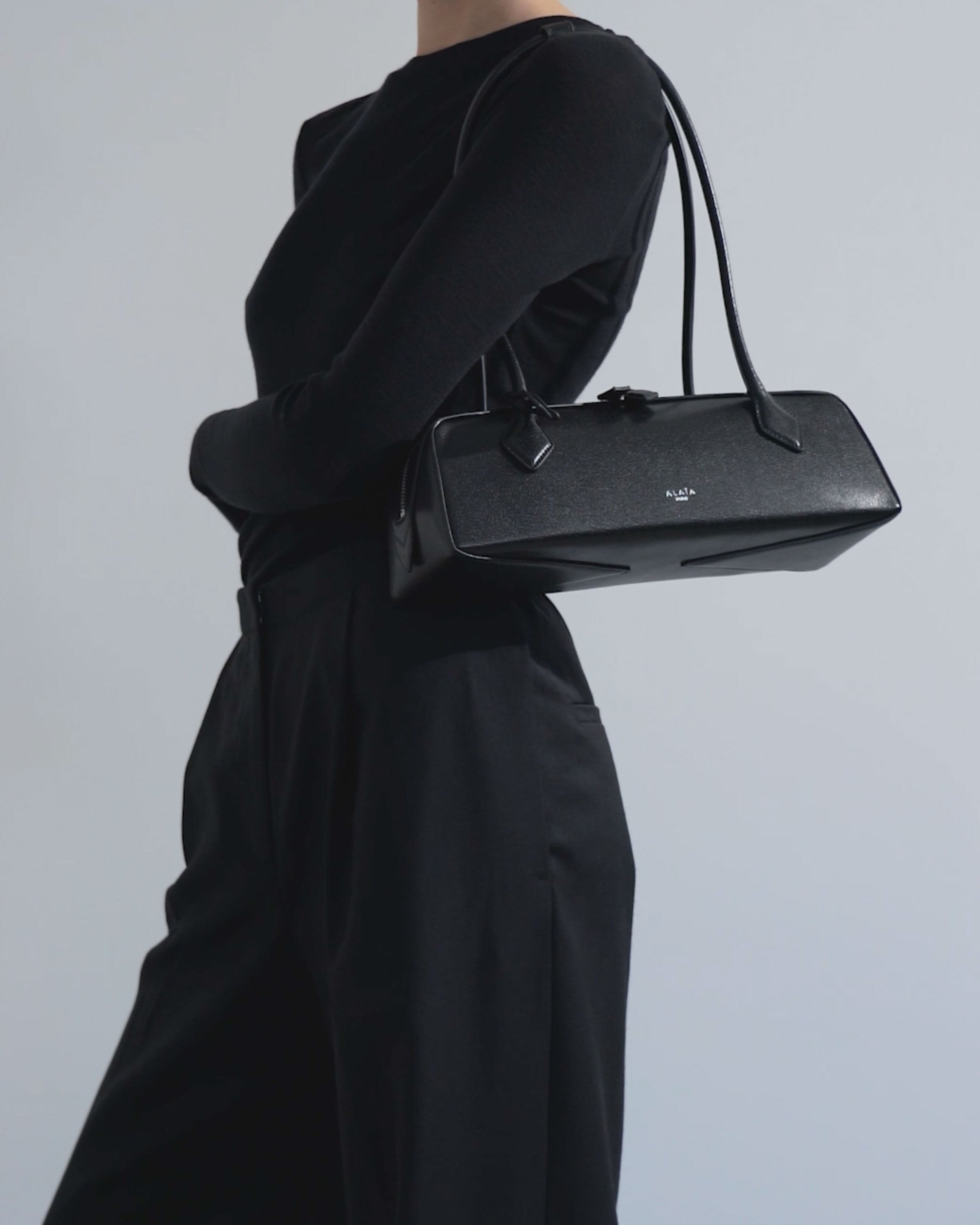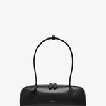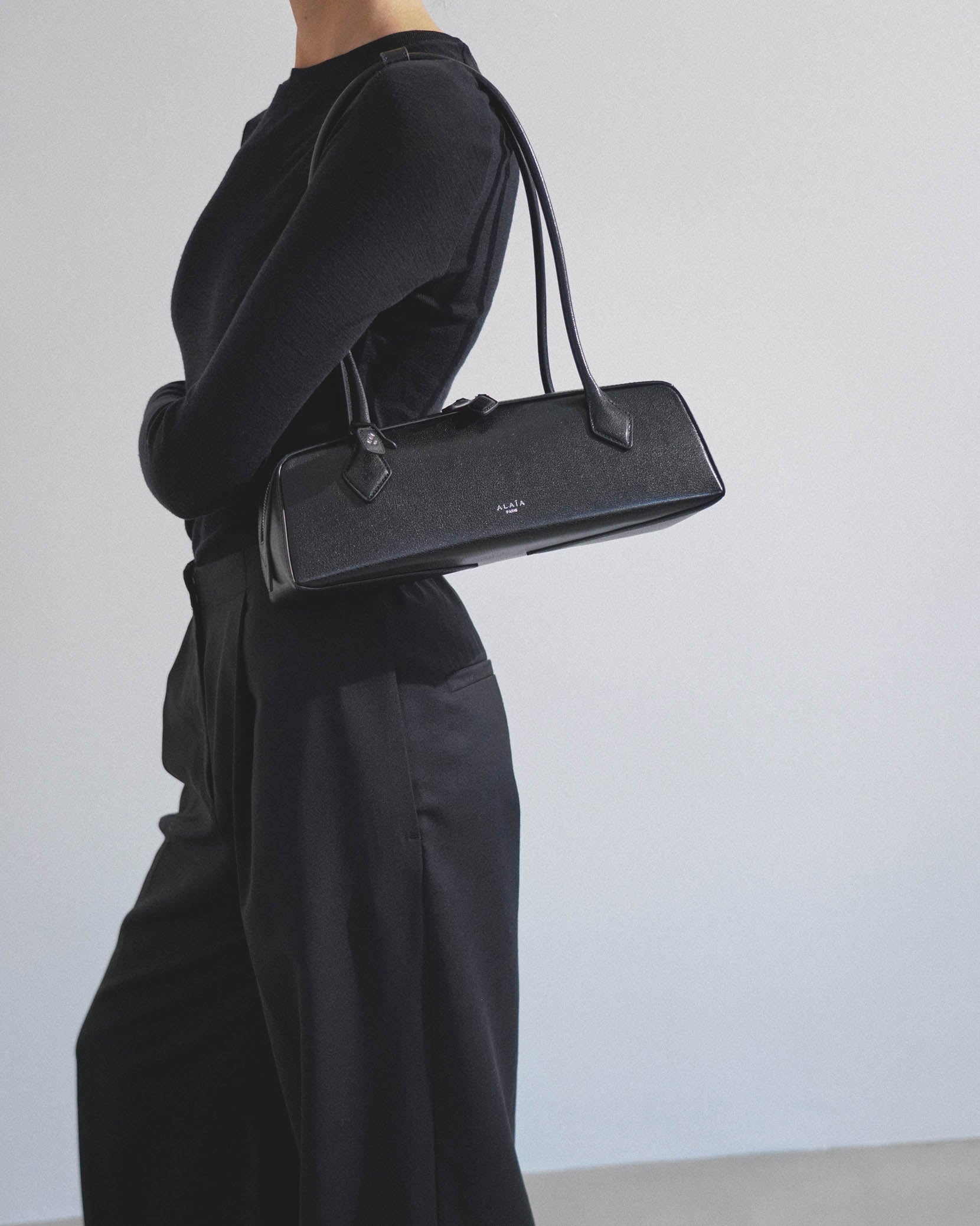Black leather shoulder bag from Alaïa. The Le Teckel bag is made of smooth leather with extended shoulder straps, a two-way zip fastening along the top, complete with a slip pocket inside to fit you cards.