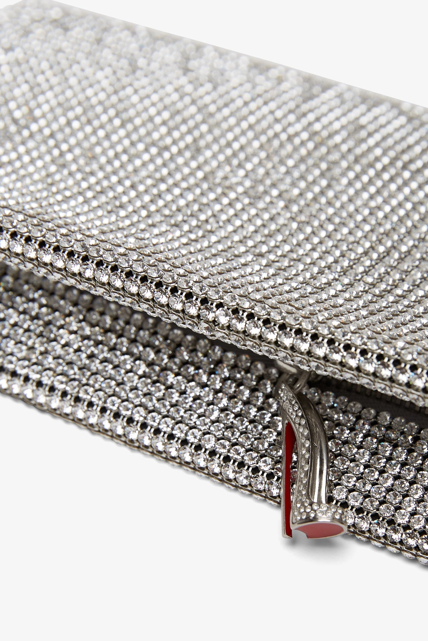 Silver crystal clutch from Christian Louboutin. The Maykimay clutch bag is made of silver crystals, featuring a zipper fastening with one main compartment and flat pocket.