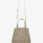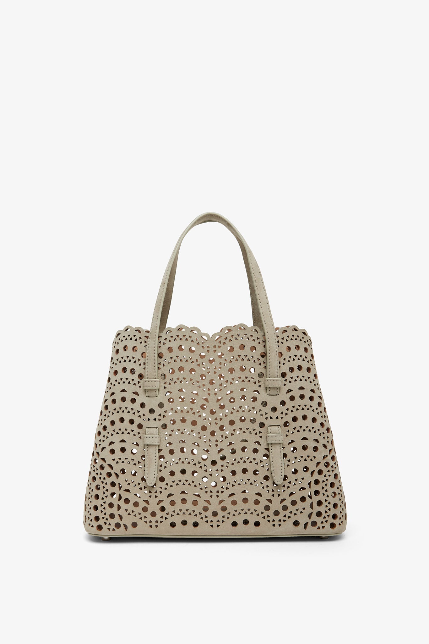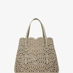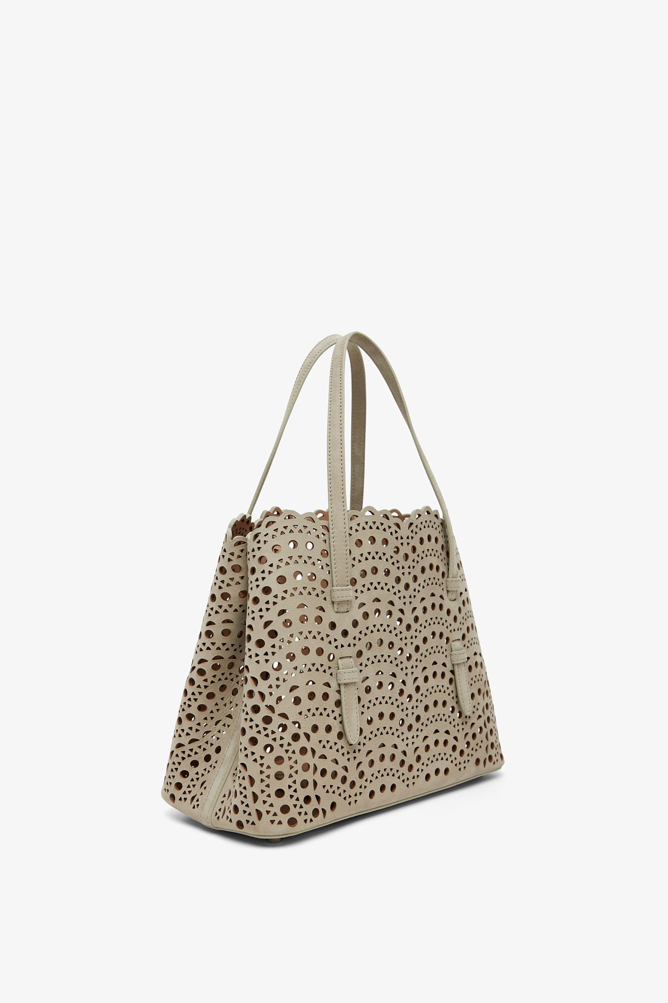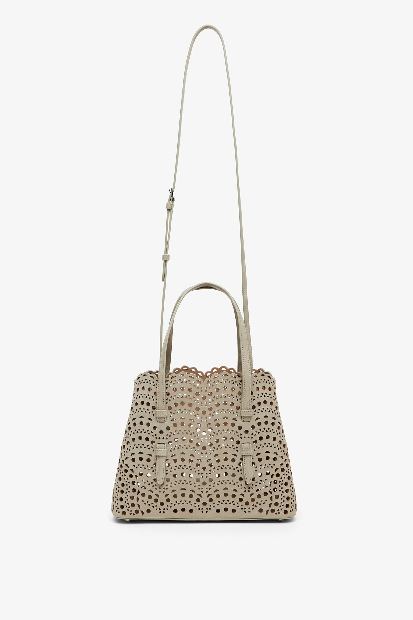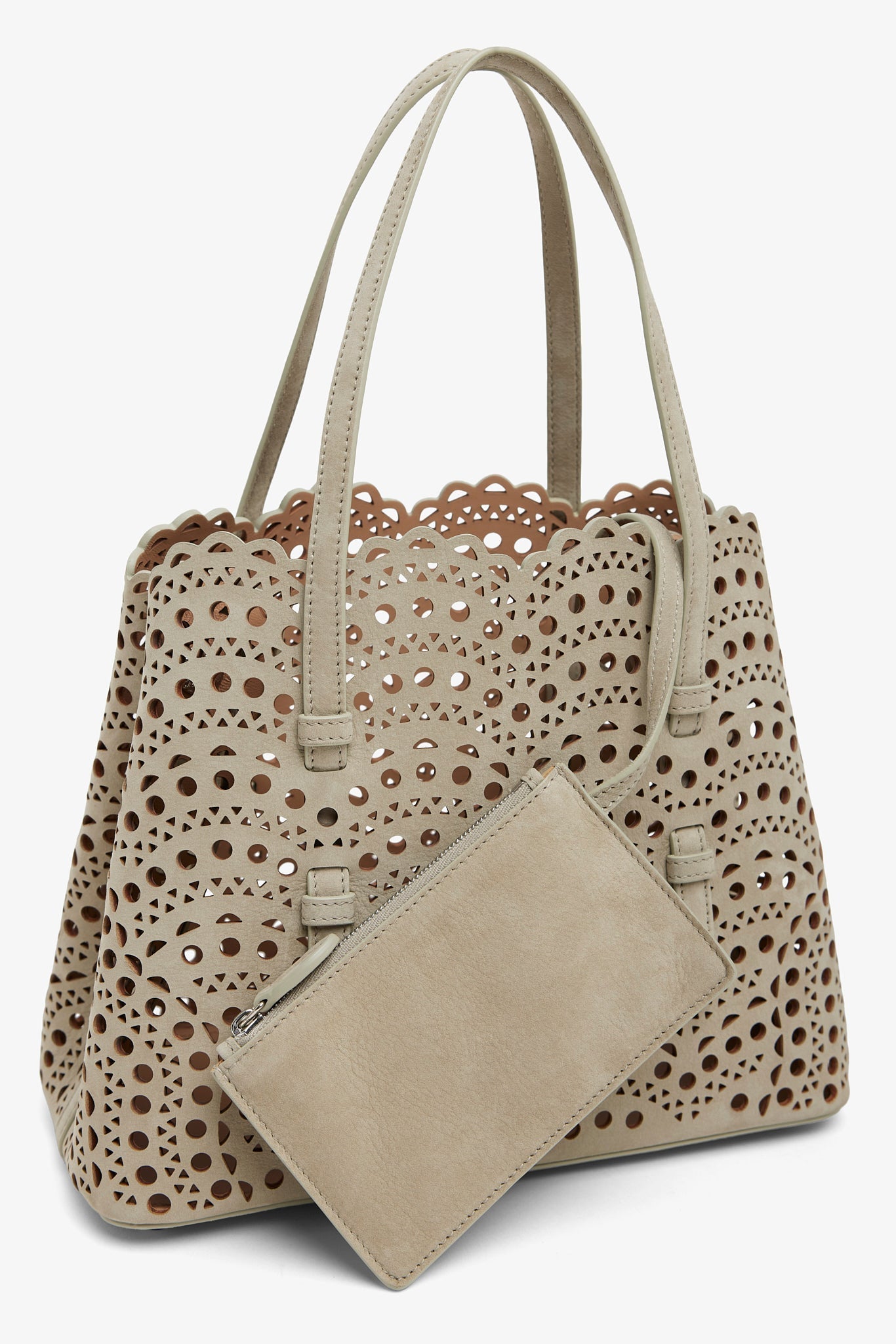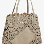 Greige leather tote bag from Alaïa. The Mina tote features the signature Vienne laser-cut nubuck suede calf leather, two top handles, an optional crossbody strap along with a detachable interior zipped pouch, unlined finish.