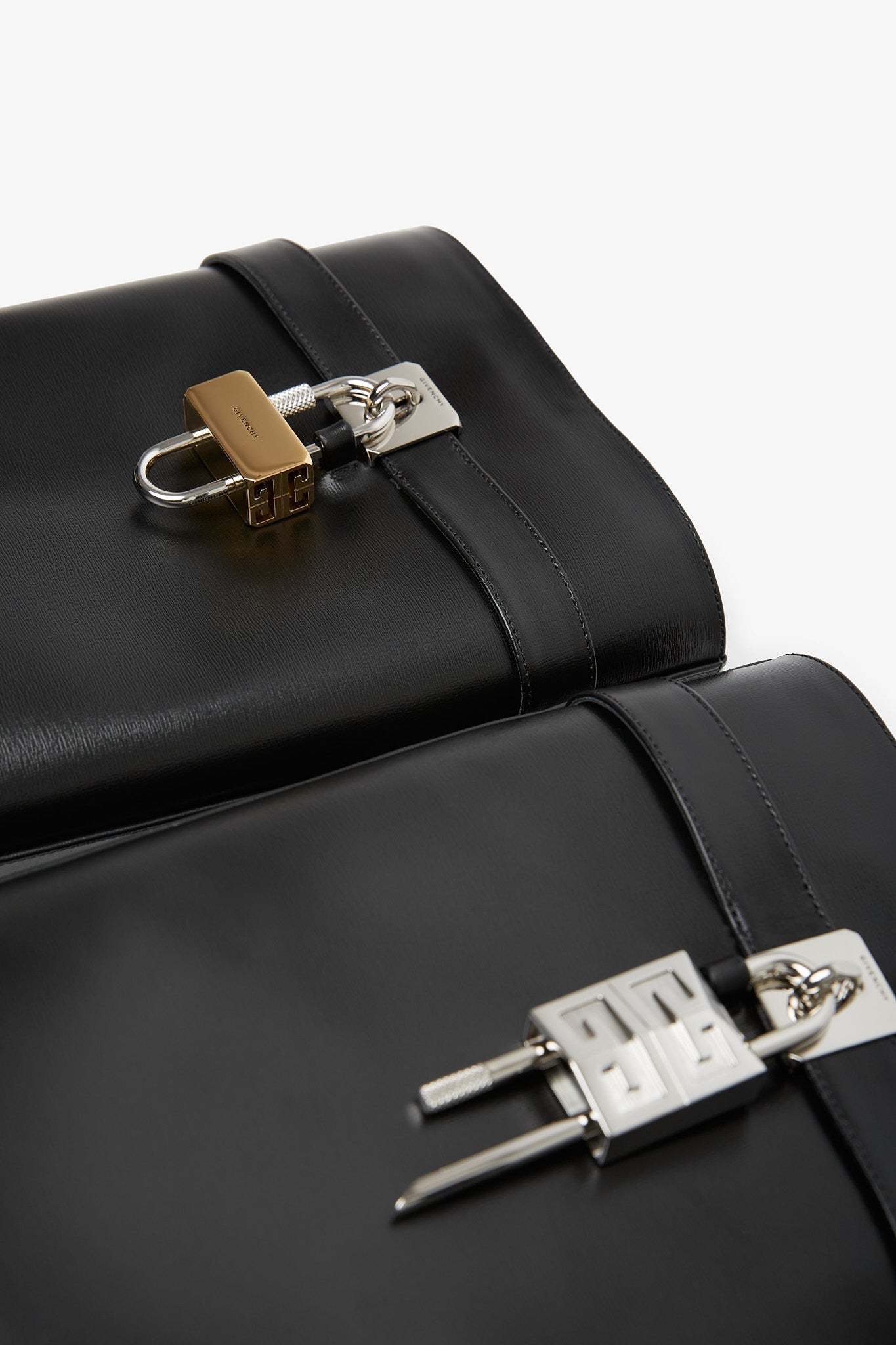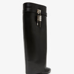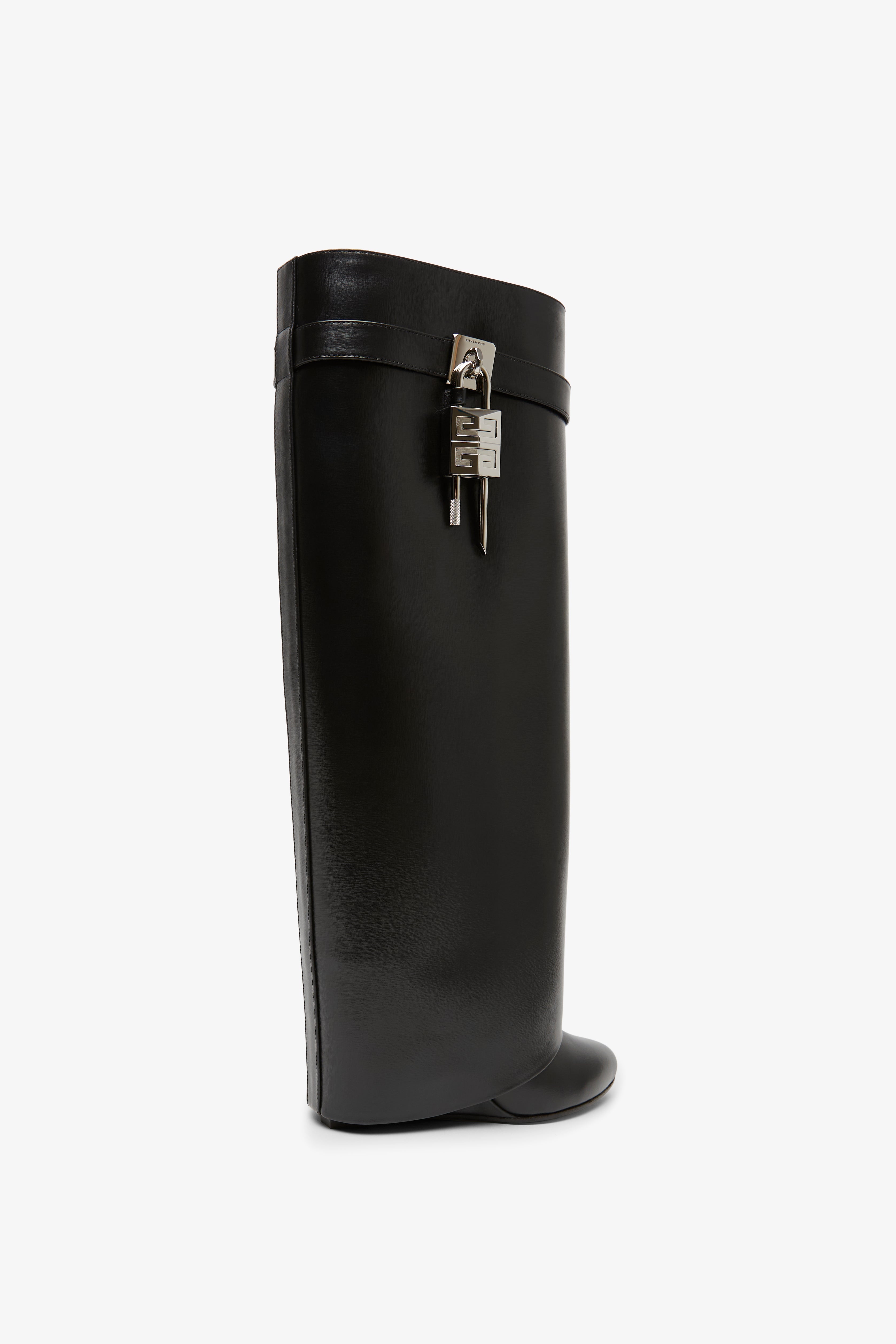 Black leather high-boots from Givenchy. The Shark lock boots are made in smooth calfskin leather in a wide fit, complete with a logo silver metal clasp and 4G padlock on the right side, and a gold and silver -finish logo padlock on the left. Set on a covered wedge heels measuring 90mm. Slips on.