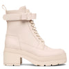 Beige leather ankle boots from Ferragamo. The Vara bow ankle boots are made of calf leather, featuring a removable shearling lining for extra warmth and the signature Vara bow for a more feminine look. It has a concealed zip on the inside and is mounted on a 40mm chunky block heel.