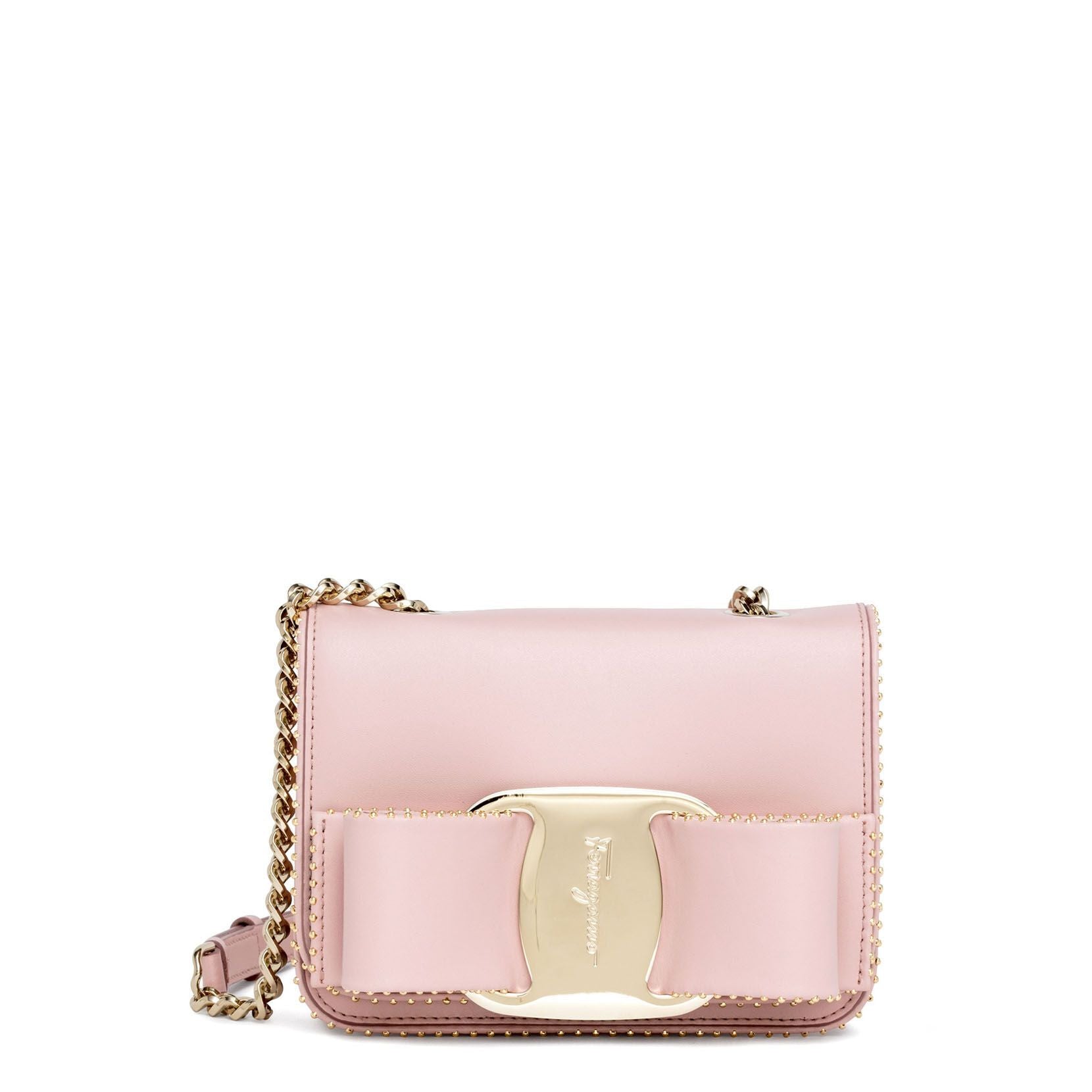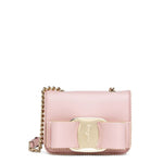 Pink leather shoulder bag with a large bow detail from Ferragamo. The Vara Rainbow has a clasp closure, a large leather and gold-tone bow detail on the front flap, and gold-tone studs. Black leather lining, a gold-tone chain, and one large compartment with a card holder completes the look.